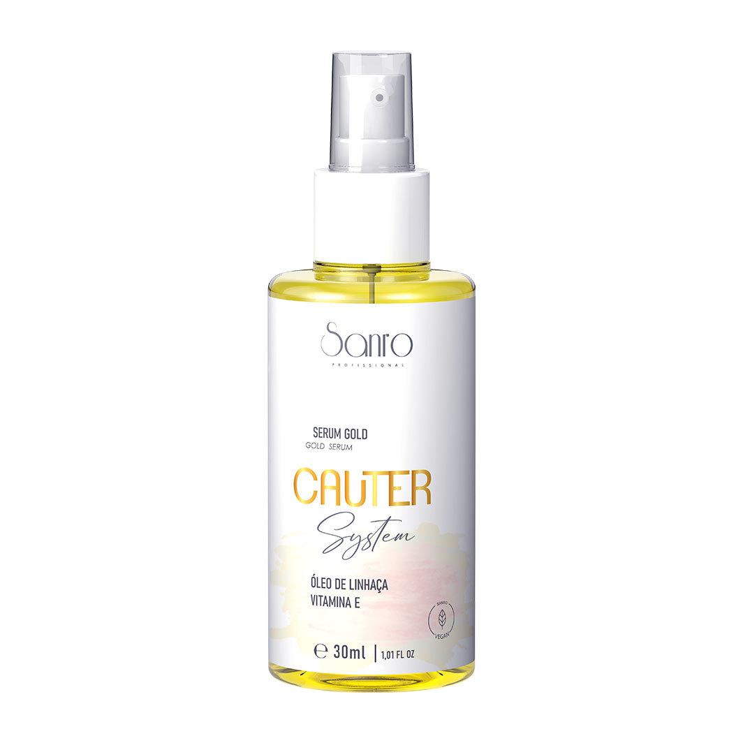 Serum Gold Cauter System contém em sua fórmula, óleo de linhaça e vitamina E; promove nutrição, restauração e resistência dos fios. Deixa os cabelos leves, macios, brilhantes e sem frizz. Contém proteção térmica.